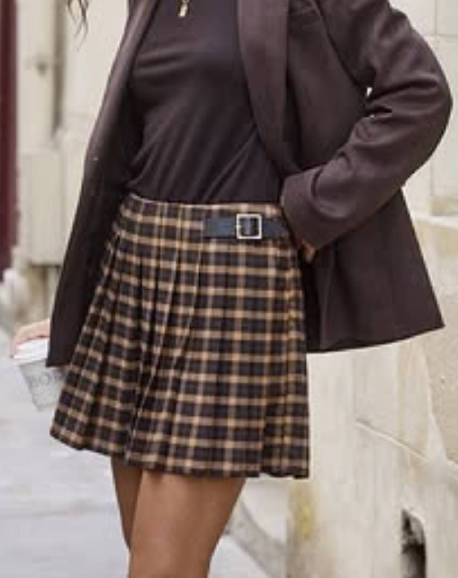 Jupe courte camel unie avec une coupe droite et une fermeture zippée