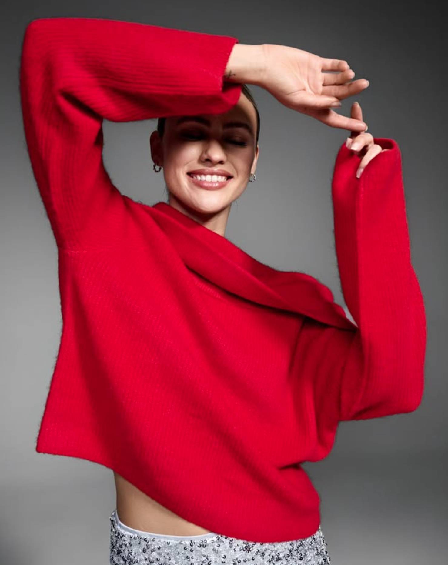 Pull bordeaux uni avec une coupe droite à col rond et des manches longues