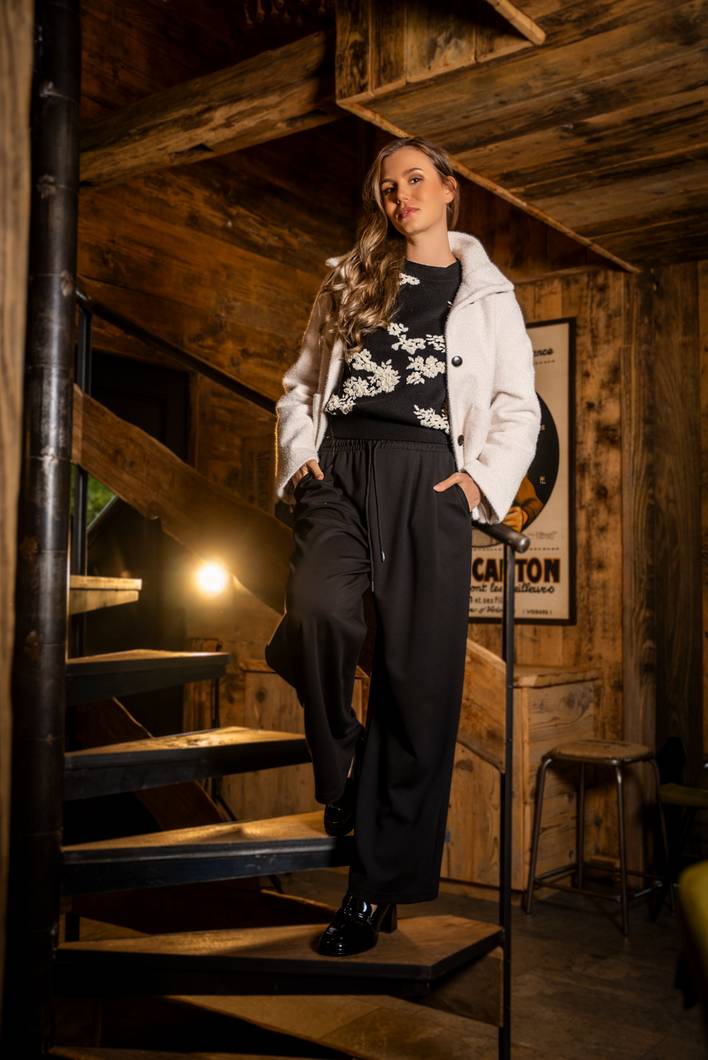 Pantalon noir uni avec deux poches plaquées et une coupe évasée