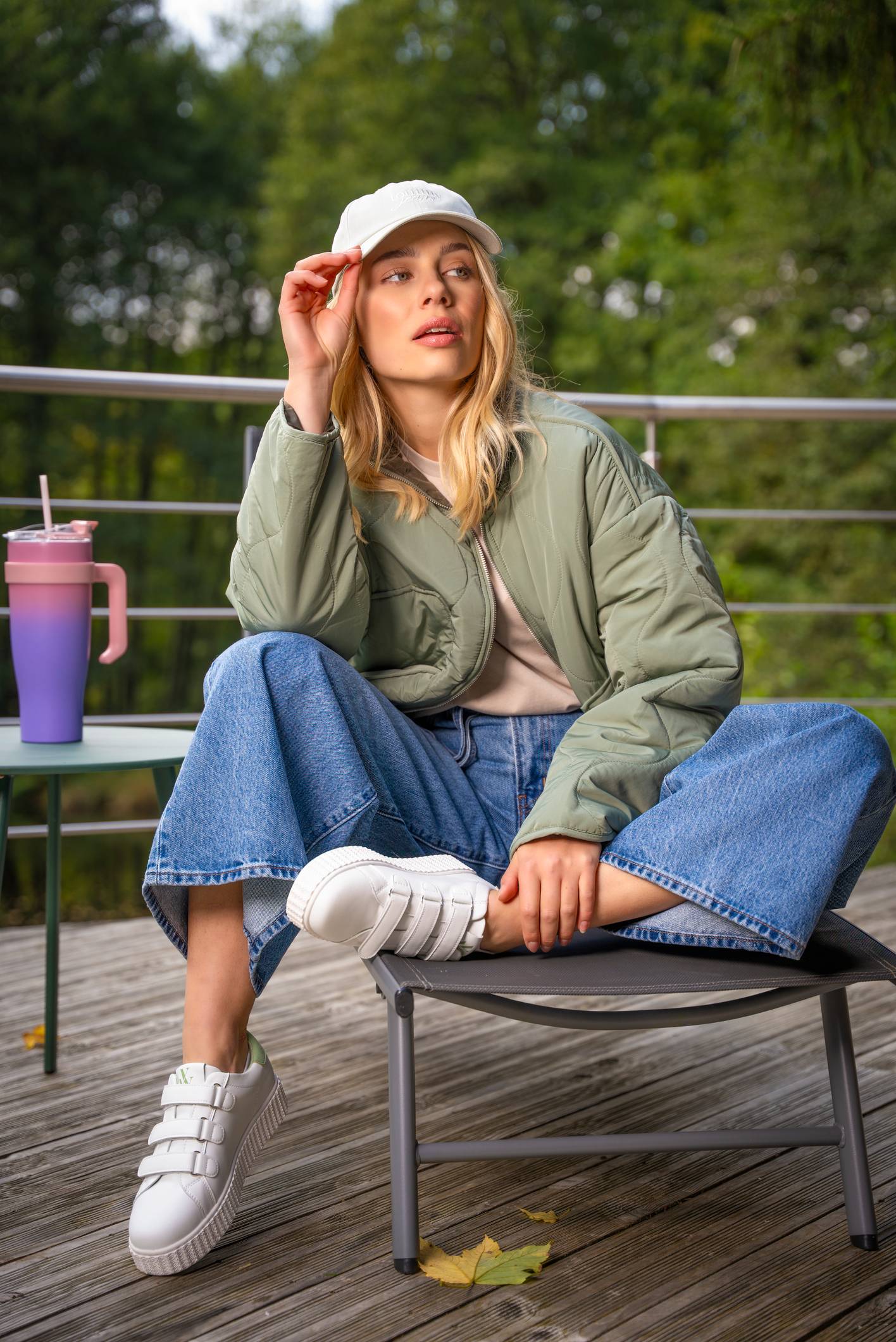 Tennis blanches et kaki avec lacets plats et logo de la marque
