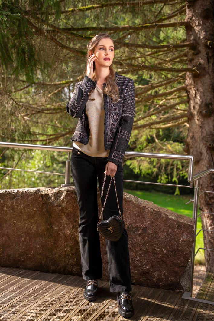 Blazer noir en tissu tweed orné de strass et pourvu de manches longues