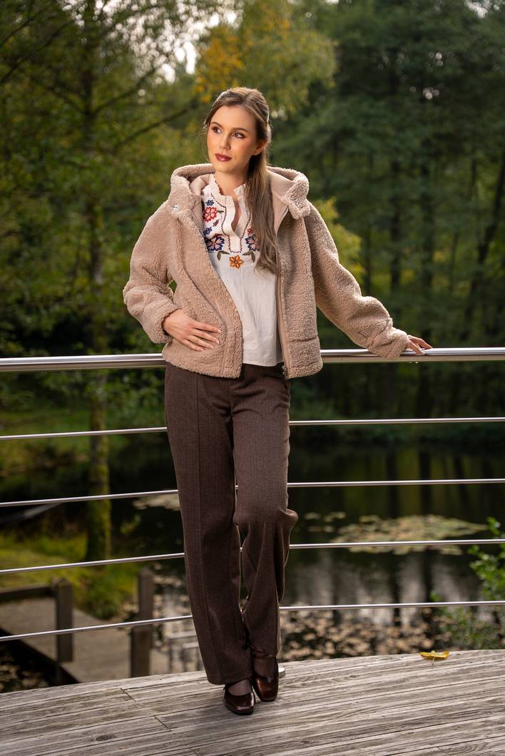 Blouson camel uni avec une coupe ample et un col châle en sherpa