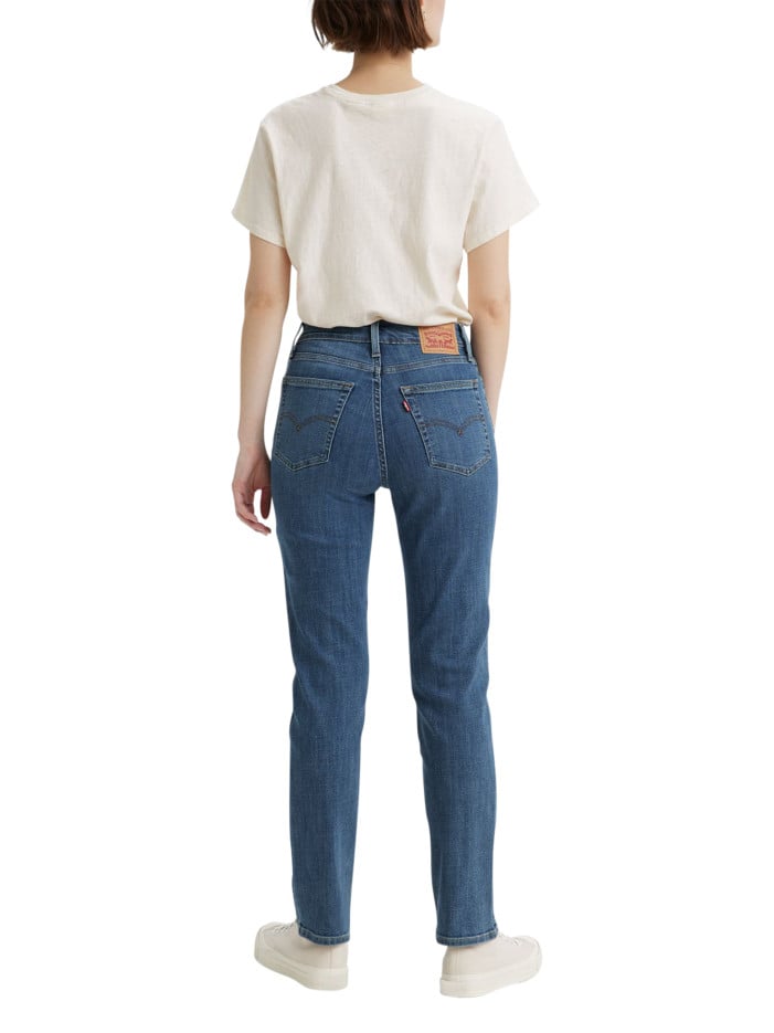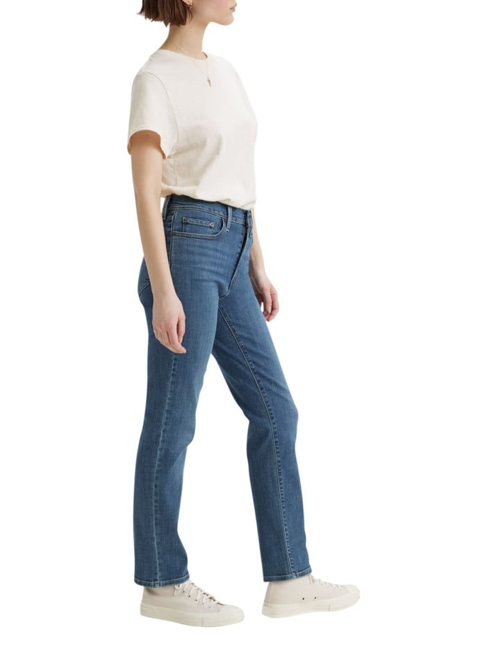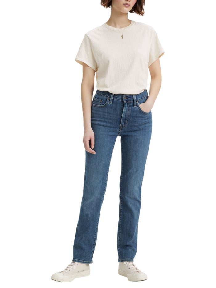 Jean 724 bleu uni avec une coupe slim une taille haute et des passants
